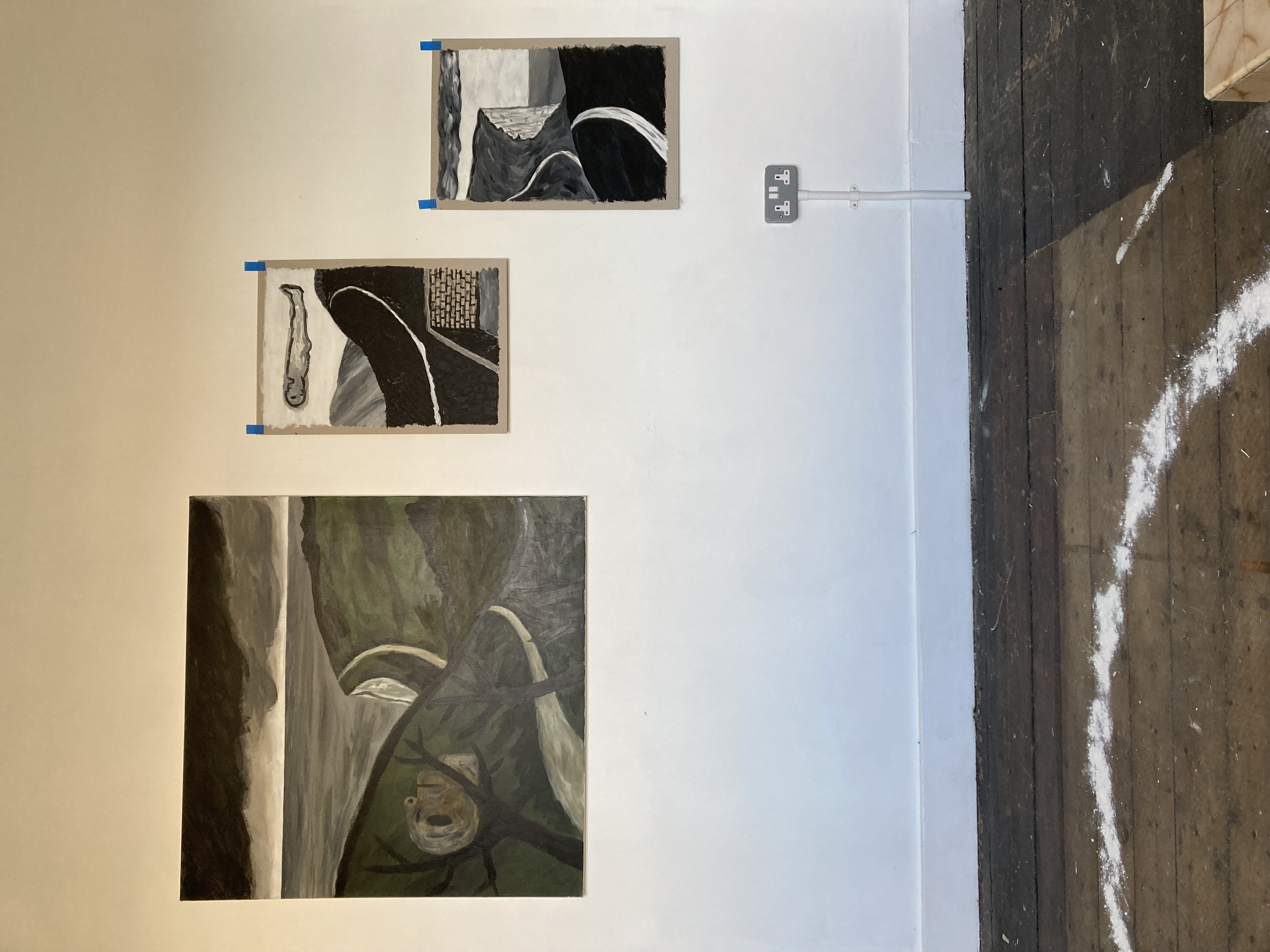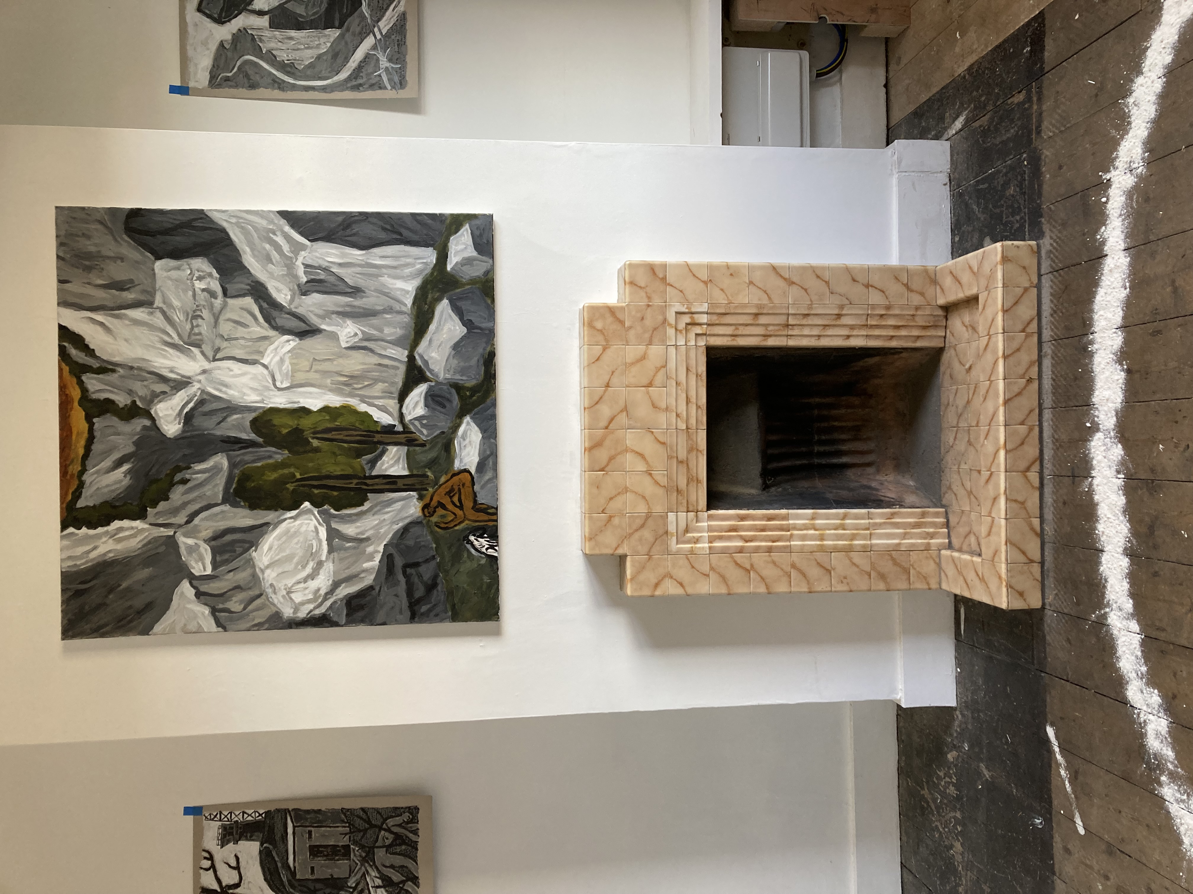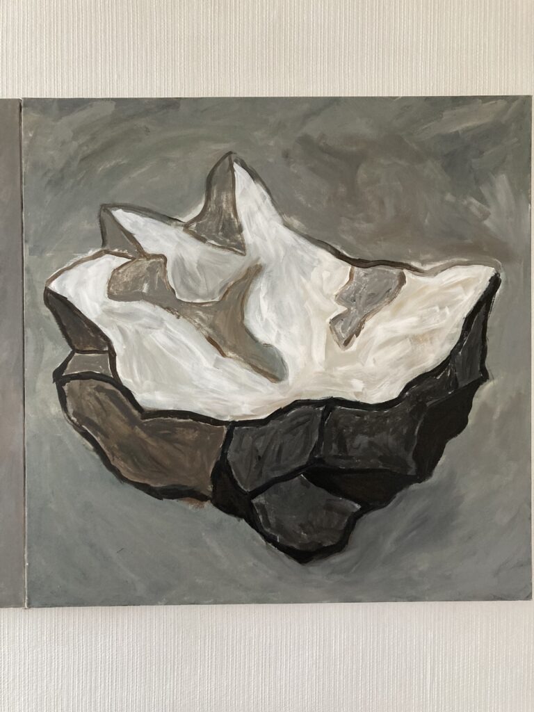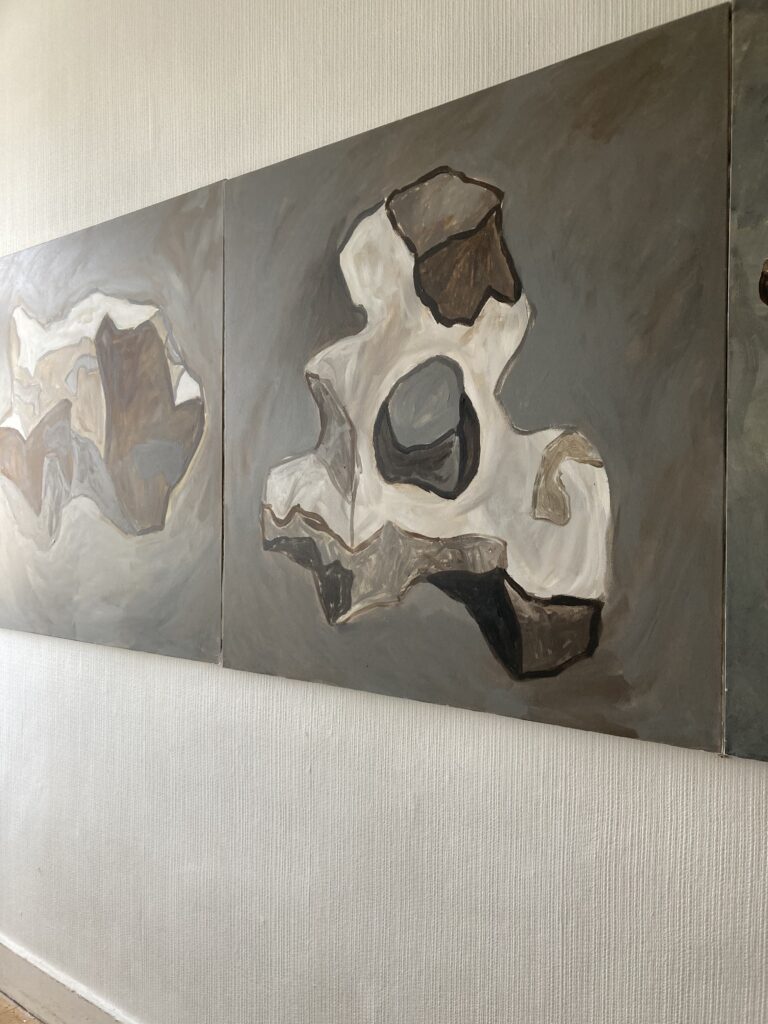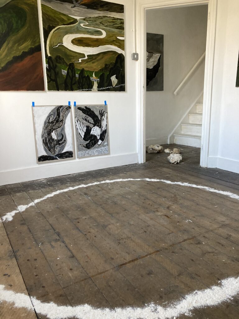 Chalk covered flints, large scale paintings, geological elements.