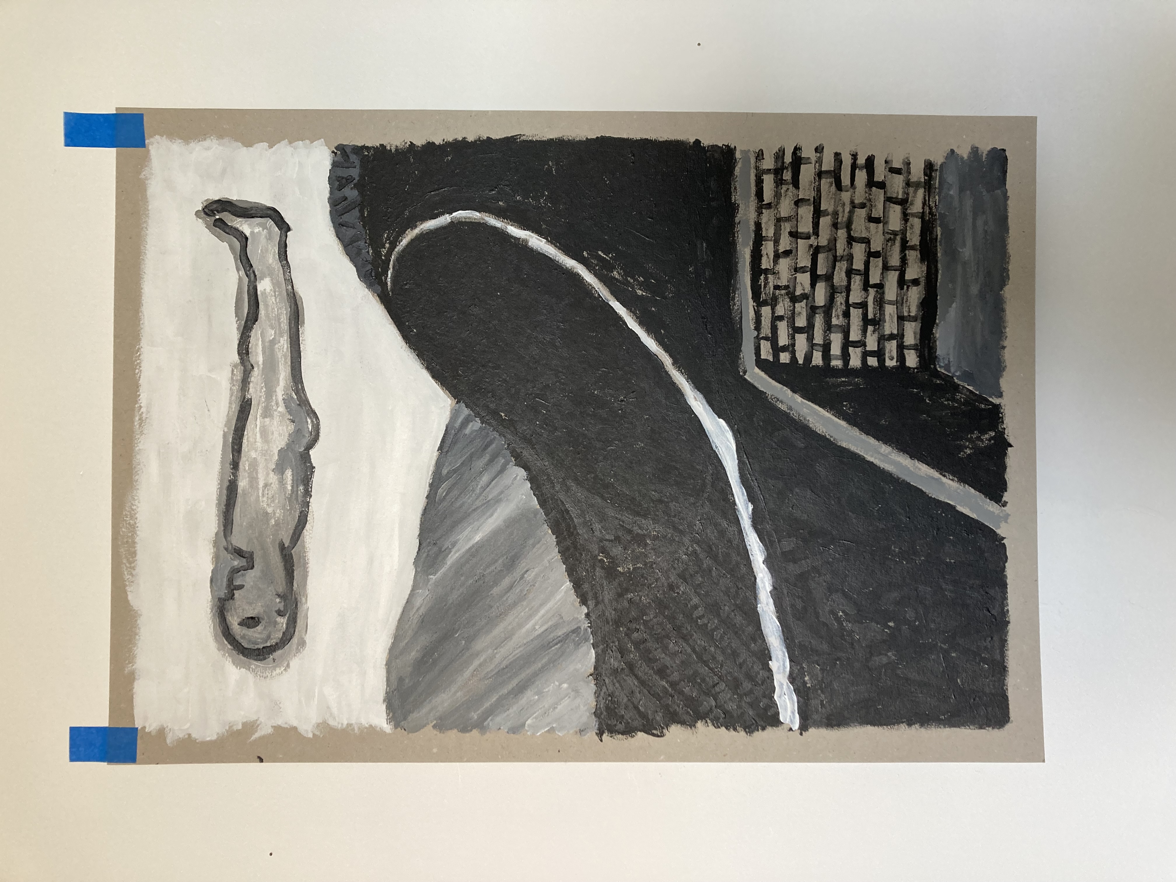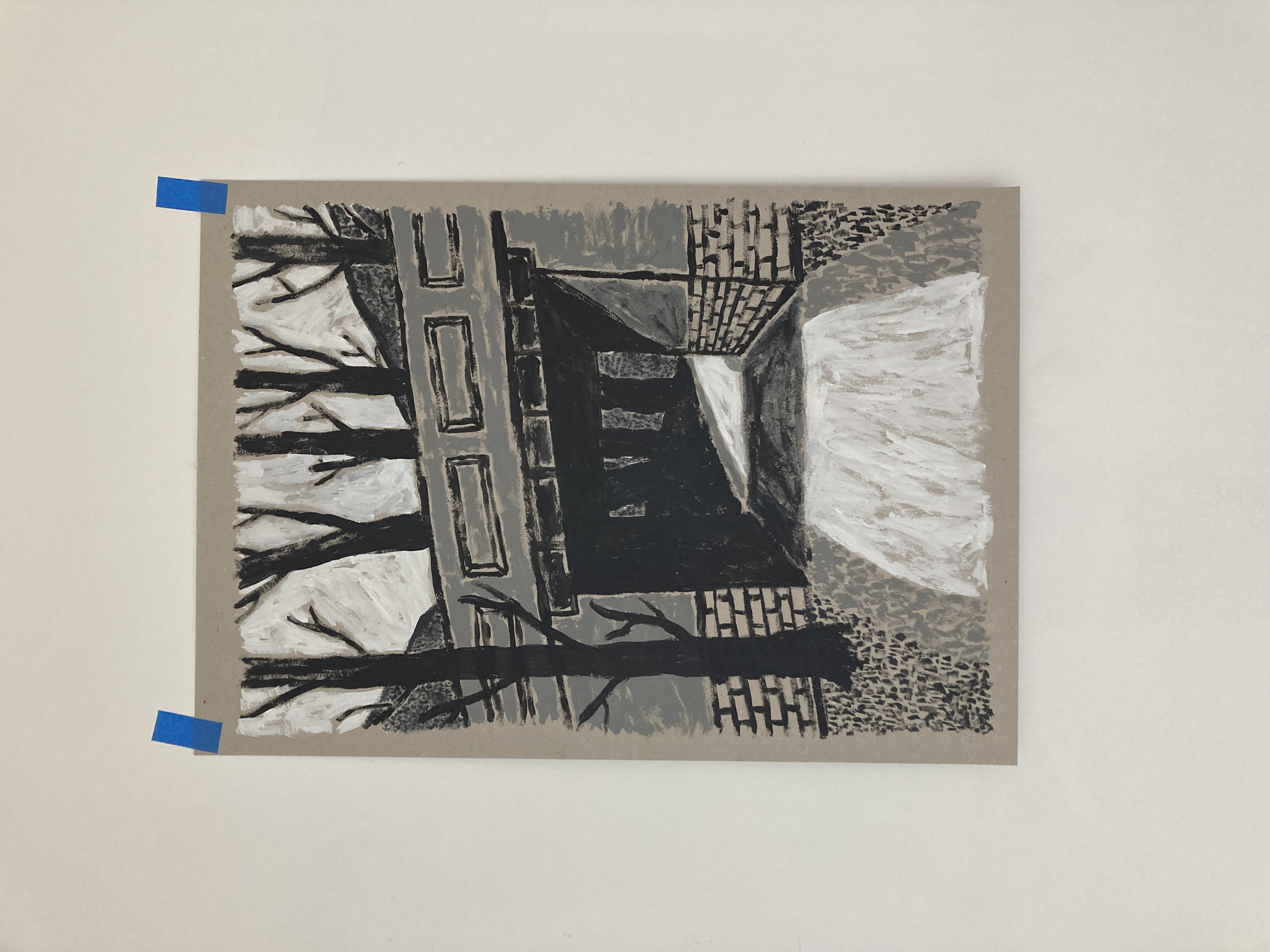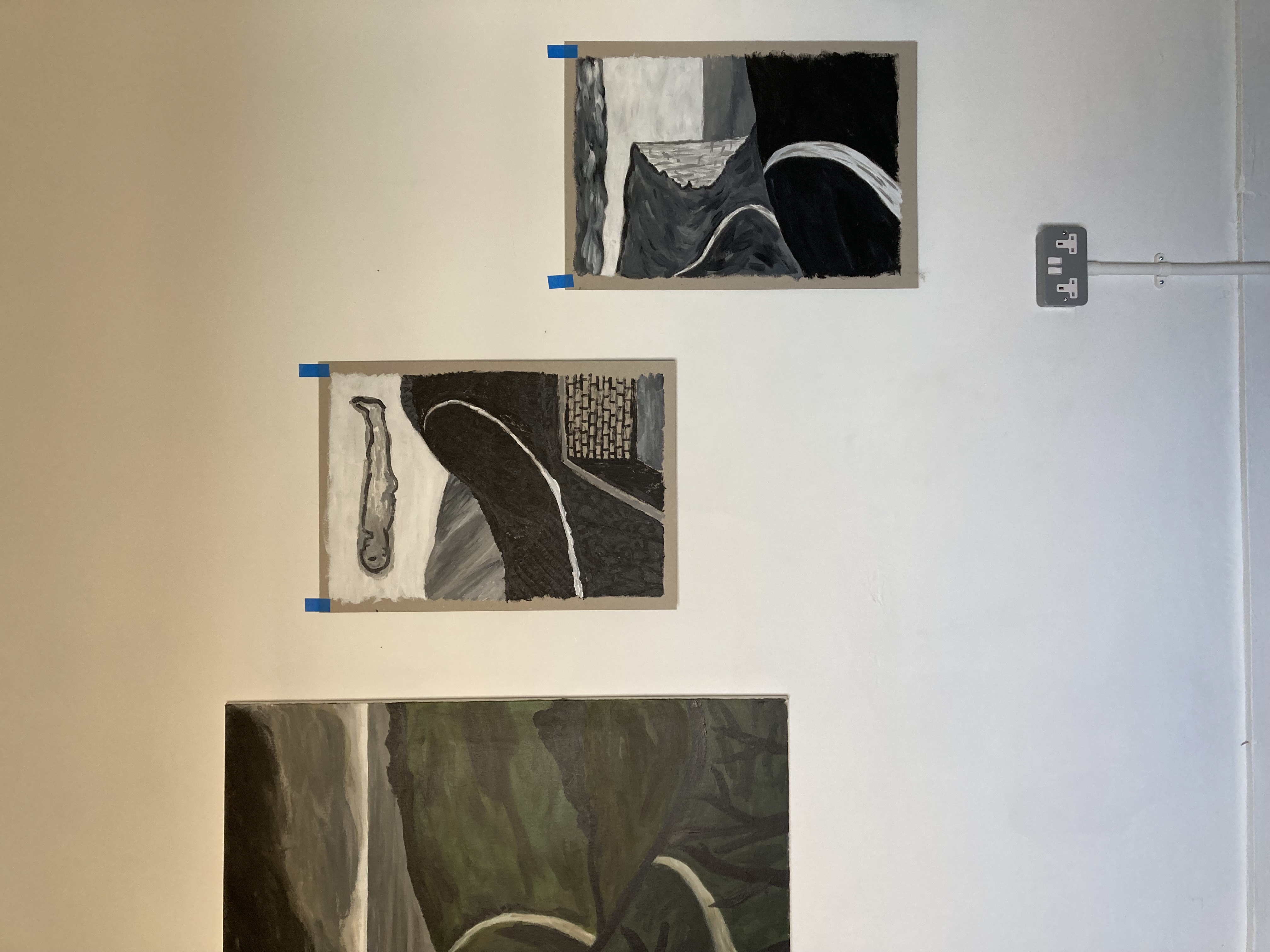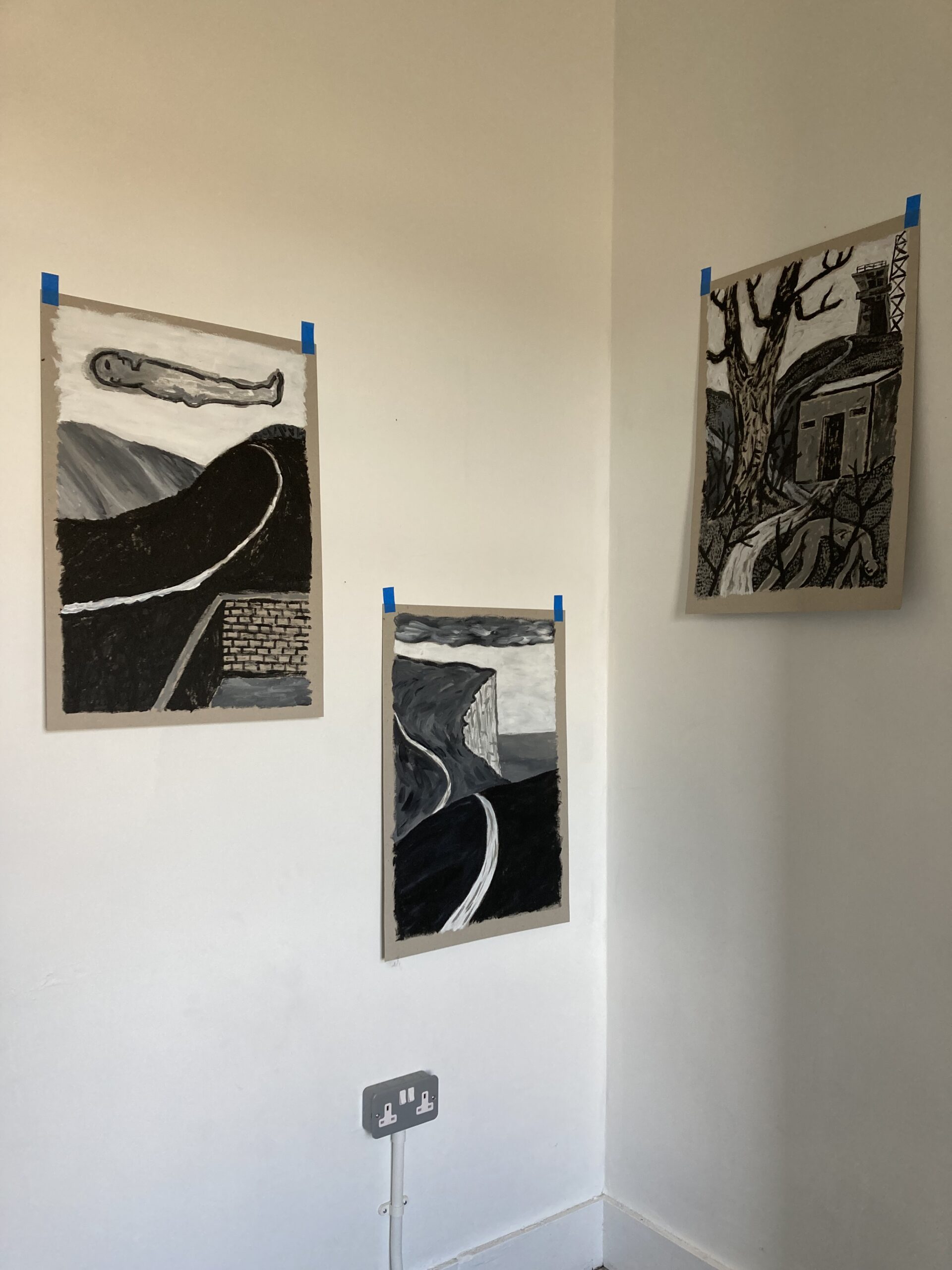 Chalk covered flints, large scale paintings, geological elements.
